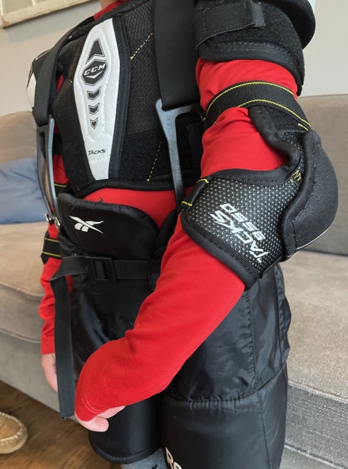 When getting your player ready it is important to have a base layer under the equipment, this prevents any rubbing of velcro straps on the skin especially around the legs due to the knee pads and also the elbow pads and shoulder pads.