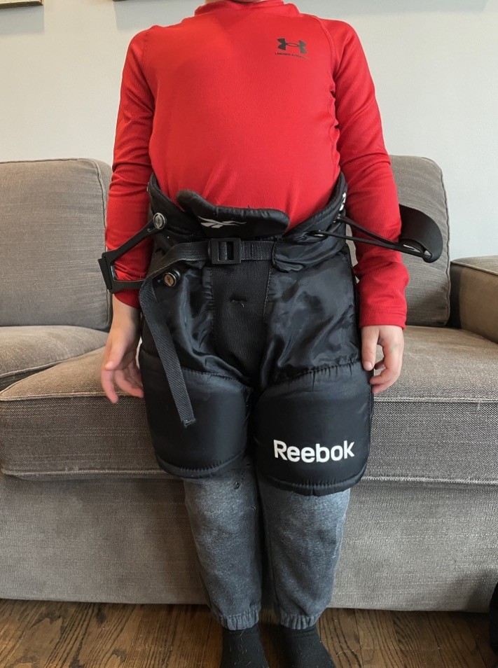 Next will be the hockey pants (Sometimes referred to as breezers). Pull the pants over the shin guards. Suspenders are also helpful and the link is below.
